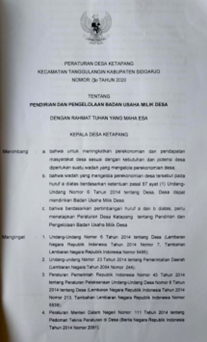 [6] Martarida Bagaihing, C. M. M., Beno, J. B., & Nugraha, Y. E. (2020). Peraturan Desa Nomor: 06 Tahun 2020 Sidoarjo. Pemerintah Desa Ketapang.