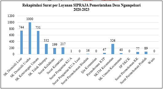 Penggunaan aplikasi Sipraja pada Pemerintahan Desa Ngampelsari telah berjalan dan meningkat. Berdasarkan data diatas, urutan terbanyak dalam penggunaan aplikasi Sipraja ialah SK Domisili Usaha dengan prosentase sebanyak 1000 pengguna layanan. Hal ini karena padatnya penduduk sehingga warga Ngampelsari banyak yang memanfaatkan keadaan tersebut dengan membuka usaha perdagangan. Selanjutnya penggunaan aplikasi Sipraja pada SK Domisili Luar memiliki prosentase sebanyak 744 pengguna layanan. Kemudian SK Keterangan Umum memiliki prosentase sebanyak 731 pengguna layanan, SK Tidak Mampu memiliki prosentase sebanyak 332 pengguna layanan, SKTM Kecamatan memiliki prosentase sebanyak 326 pengguna layanan, Surat Permohonan Pindah memiliki prosentase sebanyak 89 pengguna layanan, Surat Permohonan KK memiliki prosentase sebanyak 77 pengguna layanan, Permohonan KTP memiliki prosentase sebanyak 47, SK Umum Kecamatan memiliki prosentase sebanyak 40 pengguna layanan, Surah Permohonan Biodata memiliki prosentase sebanyak 16 pengguna layanan, dan Surat Pengantar KUA memiliki prosentase sebanyak 1 pengguna layanan. Sedangkan pada layanan Surat pengantar KUA Luar, Ijin Keramaian, SP SKCK, dan Waris memiliki prosentase sebanyak 0 pengguna layanan.