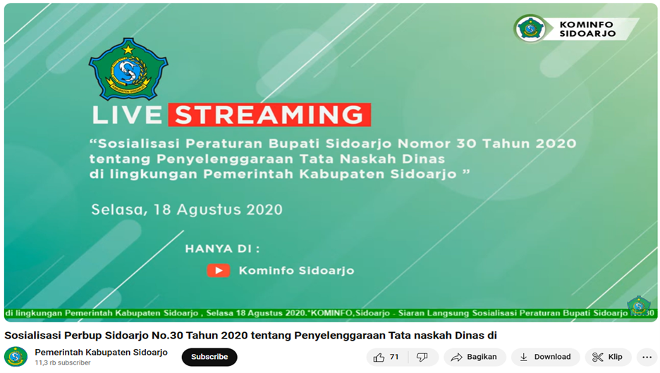 Wawancara ini berlangsung pada 27 Maret 2024. Dari pernyataan tersebut dapat disimpulkan bahwa, Pemerintah Kabupaten Sidoarjo telah menyelenggarakan sosialisasi dengan melibatkan seluruh Organisasi Perangkat Daerah (OPD) di wilayah tersebut. Sosialisasi dan pelatihan teknis secara daring telah dilaksanakan serentak melalui kanal YouTube resmi. Namun, hingga saat ini, Pemerintah Kecamatan Sidoarjo belum mengadakan pelatihan teknis secara langsung, dan pelatihan teknis yang ada masih belum berjalan secara rutin. Berikut ini merupakan gambar pelaksanaan sosialisasi bimbingan teknis tentang penerapan Aplikasi E-Buddy yang lakukan melalui kanal YouTube resmi Kabupaten Sidoarjo.