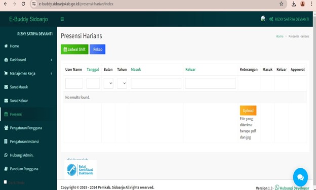 Wawancara ini dilakukan pada tanggal 12 Juli 2024. Dari pernyataan tersebu dapat disimpulkan bahwa, Sejumlah perangkat desa mengalami hambatan dalam memanfaatkan Aplikasi E-Buddy, baik karena koneksi internet yang tidak stabil maupun kompleksitas navigasi menu. Akibatnya, mereka lebih memilih menggunakan sistem presensi manual yang dianggap lebih mudah dan cocok, terutama bagi yang kurang familiar dengan teknologi. Di bawah ini terdapat gambar Tampilan menu Presensi pada Aplikasi E-Buddy untuk proses absensi di Pemerintah Desa Rangkah Kidul, Kecamatan Sidoarjo, Kabupaten Sidoarjo.
