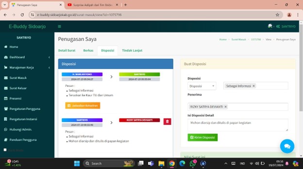 Berdasarkan hasil wawancara, dapat disimpulkan bahwa Kasi Pelayanan Tata Usaha dan umum memegang peran kunci penting dalam pengelolaan Aplikasi E-Buddy. karena menangani semua aspek terkait aplikasi, termasuk surat masuk dan keluar, serta memastikan aplikasi digunakan dengan benar. Berikut ini adalah gambar tampilan menu disposisi pada Aplikasi E-Buddy yang digunakan untuk mendisposisikan surat dinas di Pemerintah Desa Rangkah Kidul, Kecamatan Sidoarjo, Kabupaten Sidoarjo.