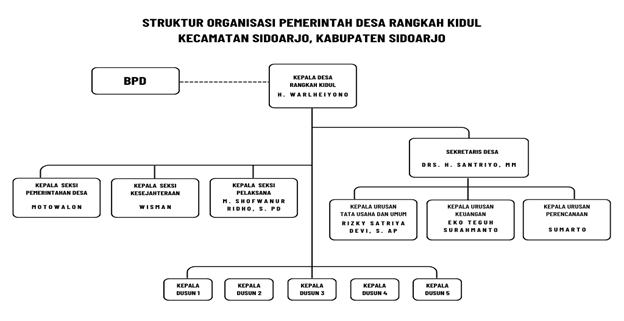 Struktur organisasi merupakan cara formal untuk mengelompokkan individu dan tugas, dan mengendalikan interaksi dan aktivitas di seluruh divisi organisasi. Cara umum untuk mengilustrasikannya adalah dengan bagan organisasi. Struktur organisasi berfungsi sebagai gambaran tambahan tentang jenis organisasi, pembagian departemen, jabatan resmi, dan kekuasaan. Ini juga menggambarkan hubungan kerja, rantai komando, tugas, rentang kendali, dan struktur kepemimpinan dalam organisasi. Secara umum struktur organisasi membagi pekerjaan menjadi beberapa fungsi yang keadaan ideal . Struktur organisasi birokrasi di Pemerintah Desa Rangkah Kidul, Kecamatan Sidoarjo, Kabupaten Sidoarjo umumnya mengikuti pola standar organisasi pemerintahan desa yang diatur dalam peraturan perundang-undangan Indonesia. Struktur ini dirancang untuk memastikan setiap bidang dalam pemerintahan desa terkelola dengan baik, mulai dari administrasi, pembangunan, hingga kesejahteraan masyarakat, serta menjamin terwujudnya tata kelola pemerintahan di Desa Rangkah Kidul.
