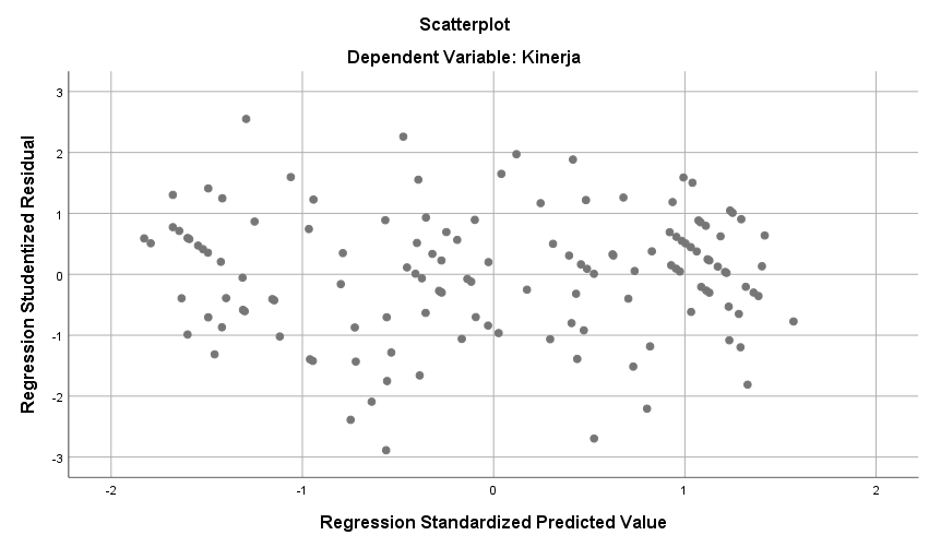 Heteroskedastisitas merupakan kondisi di mana varians variabel tidak konstan untuk setiap pengamatan atau observasi. Dalam penelitian ini, ditemukan bahwa tidak terjadi heteroskedastisitas pada model regresi. Hal ini dapat dikonfirmasi melalui hasil grafis yang telah dilakukan, seperti yang terlihat pada scatterplot berikut: